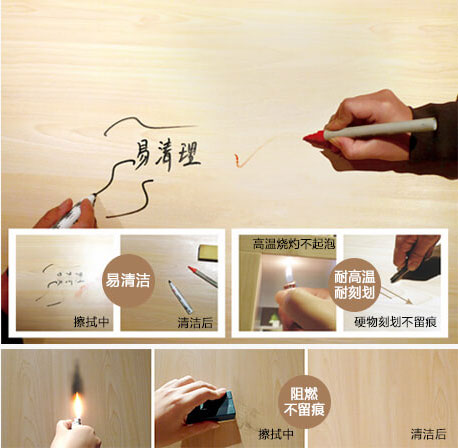 采用三胺饰面,以热压机在500℃高温下以1600吨级下压力持续45秒一次性热压而成,具有很强的抗酸碱性,同时能够有效防御其他腐蚀,能够有效抵御各种机能的颜料侵蚀,如因不当操作造成板材表面涂污,只需用抹布轻轻擦拭即可完成清洁。家具产品采用了工业级防火标准,有效抵御瞬时火侵(以国际标准,耐火等级为≦5秒明火燃烧体,即可抵御5秒内的明火灼烧)。通过特殊的强化处理,板材具有高耐磨、高抗冲击性及高抗油特性,特别是表面耐磨转数达到3000转,几乎等同家用级地板的耐磨要求。